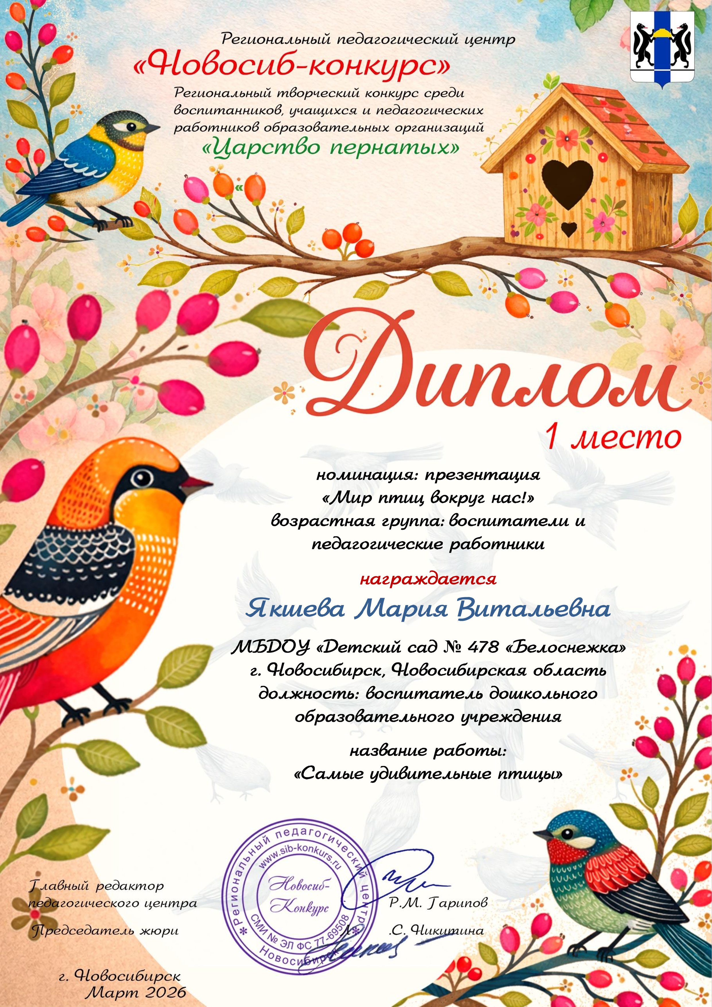 39. Региональный творческий конкурс "Царство пернатых", номинация перезентация "Мир птиц вокруг нас", название работы "Самые удивительные птицы". Награждается Якшева Мария Витальевна, диплом 1 степени